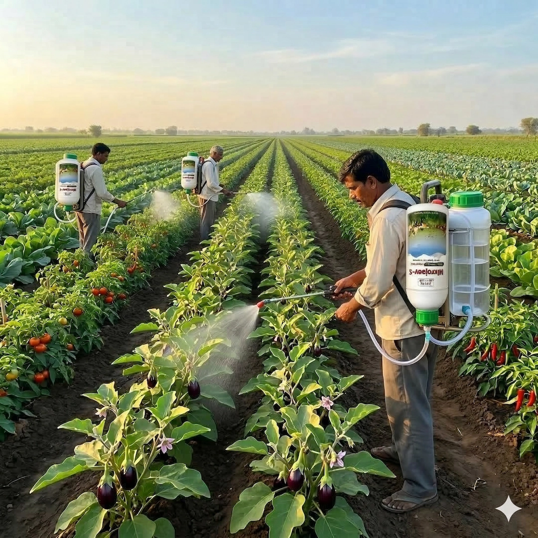 - પ્રમાણ: 1 લીટર પાણીમાં 7 થી 10 ml (અથવા 200 લીટર પાણીમાં 1.5 લીટર) માઈક્રોજીવ-એસ ભેળવવું.